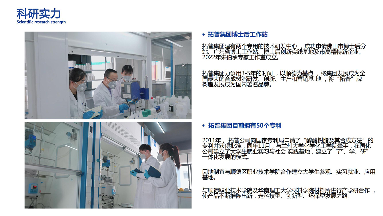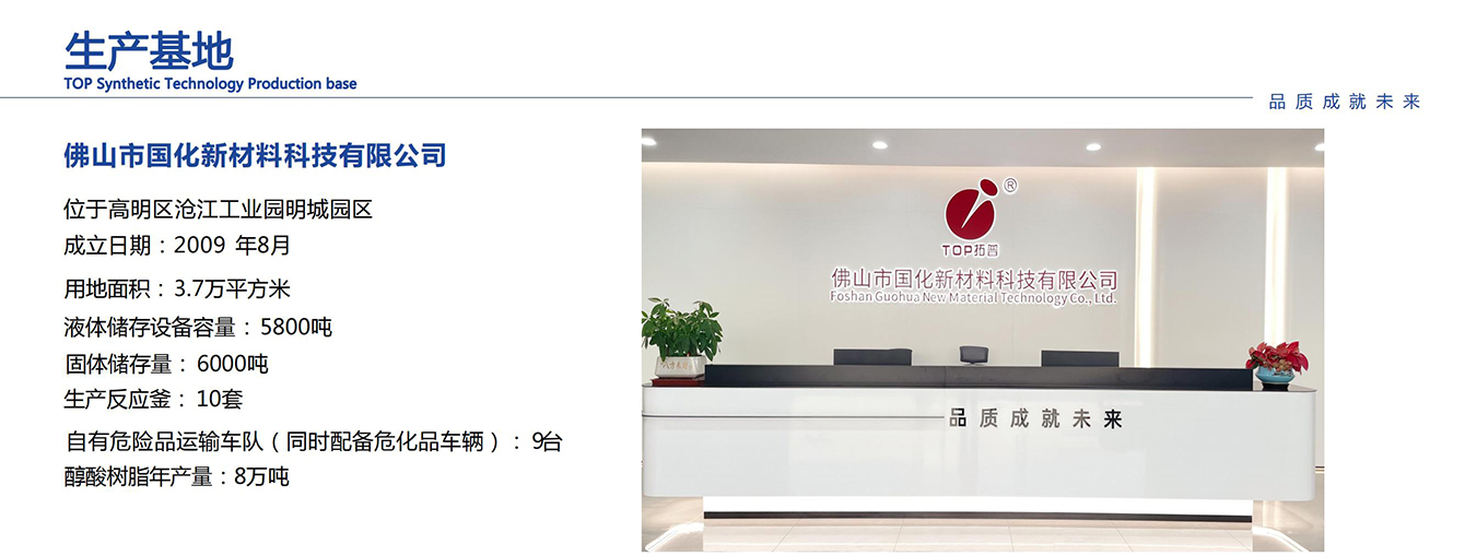 广东拓普合成科技股份有限公司位于佛山市顺德区大良街道,始建于1999年,是一家集研发、生产、销售为一体的科技型集团公司 ,主要经营危险化学品原材料,及含溶剂油的合成树脂、油漆、辅助材料、涂料制品,且具备自主经营进出口经营权,致力开展海外树脂业务。